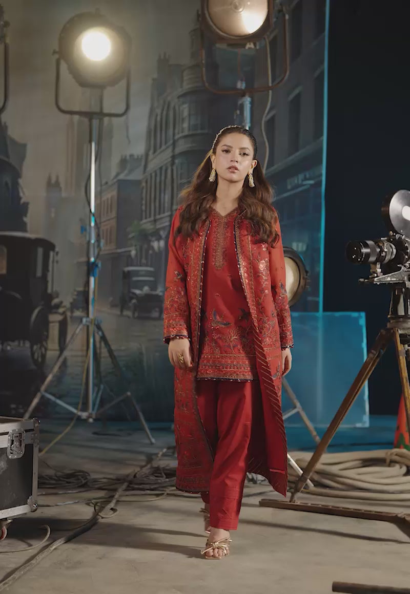 Merging timeless artistry with a contemporary flair, this red ensemble reimagines festive wear with striking originality. The cape, styled over a short shirt, channels vintage charm with a modern twist—its surface brought to life by intricate shikargah motifs embroidered in lustrous zari, radiant red sequins, and rich tones of navy blue, maroon, and red threadwork. Beneath it, the short shirt complements the grandeur with a finely detailed neckline and border that reflect the same ornate aesthetic. It's a powerful look that honors tradition while embracing bold, modern elegance.