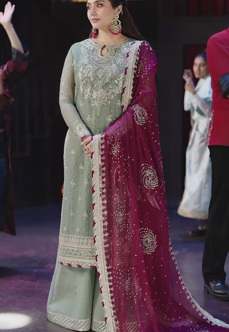 Refreshing and radiant, this mint ensemble captures the essence of understated festivity. The gorgeous shirt is adorned with light gold zari and 5mm sequins that shimmer gently like sunlight on fresh dew. Intricate threadwork in magenta and sage green hues weaves across the fabric, adding a playful yet elegant contrast. Paired with a contrasting magenta dupatta, embroidered with sequined sprays that catch the light with every graceful movement, this ensemble is a breath of fresh air—perfect for celebrations where charm meets quiet sophistication.