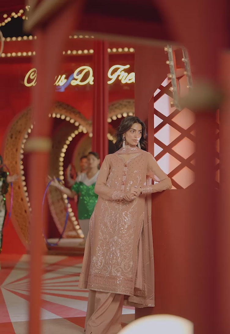 Serenity redefined, this peach outfit is a vision of soft elegance and timeless grace. The shirt is adorned with flawless embroidery in light gold zari and glistening sequins, casting a gentle radiance across the fabric. Peach-hued threads weave through the design, adding subtle depth and a harmonious tone-on-tone richness. Paired with a minimally embroidered dupatta that complements the ensemble with quiet sophistication, this look is perfect for those who find power in poise and beauty in simplicity.