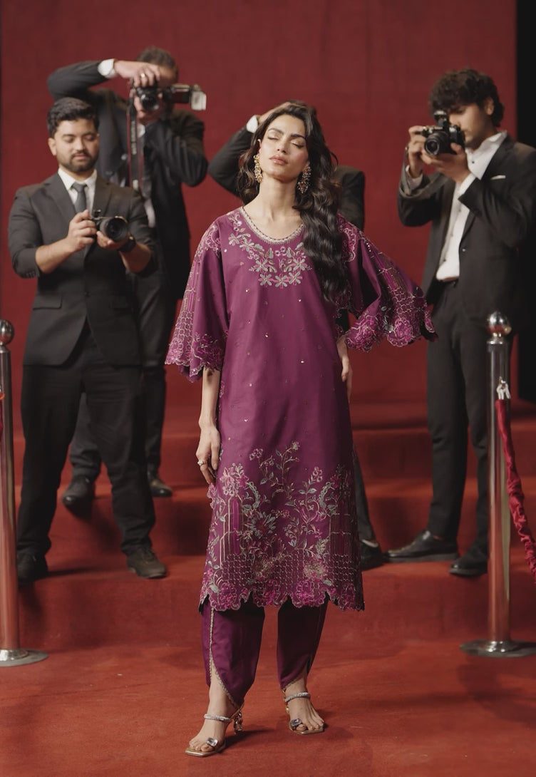 Bold as a blooming bougainvillea at dusk, this magenta ensemble is a fusion of classic charm and modern flair. The shirt gleams with antique gold sequins and two-toned gold zari, while magenta and sage green threadwork add layers of depth and artistry. Scalloped hems trace the edges of the shirt and sleeves, framing the design with graceful precision. The contemporary cut of the sleeves lends a chic twist, perfectly balanced by tulip-style trousers that complete the look with effortless poise. It’s a statement in style—vibrant, refined, and unapologetically elegant.