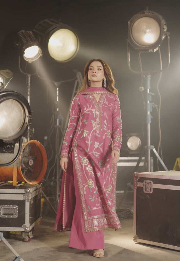 Soft as a faded rose at dawn, this dull pink ensemble exudes quiet elegance. The shirt is beautifully embroidered in a flowing foliage pattern, where light gold zari and sequins catch the light with subtle brilliance. Hints of pink and sage green threadwork breathe life into the embroidery, creating a delicate harmony of color and texture. Paired with an airy chiffon dupatta that drapes like a gentle breeze, this ensemble is a poetic expression of grace and understated luxury.