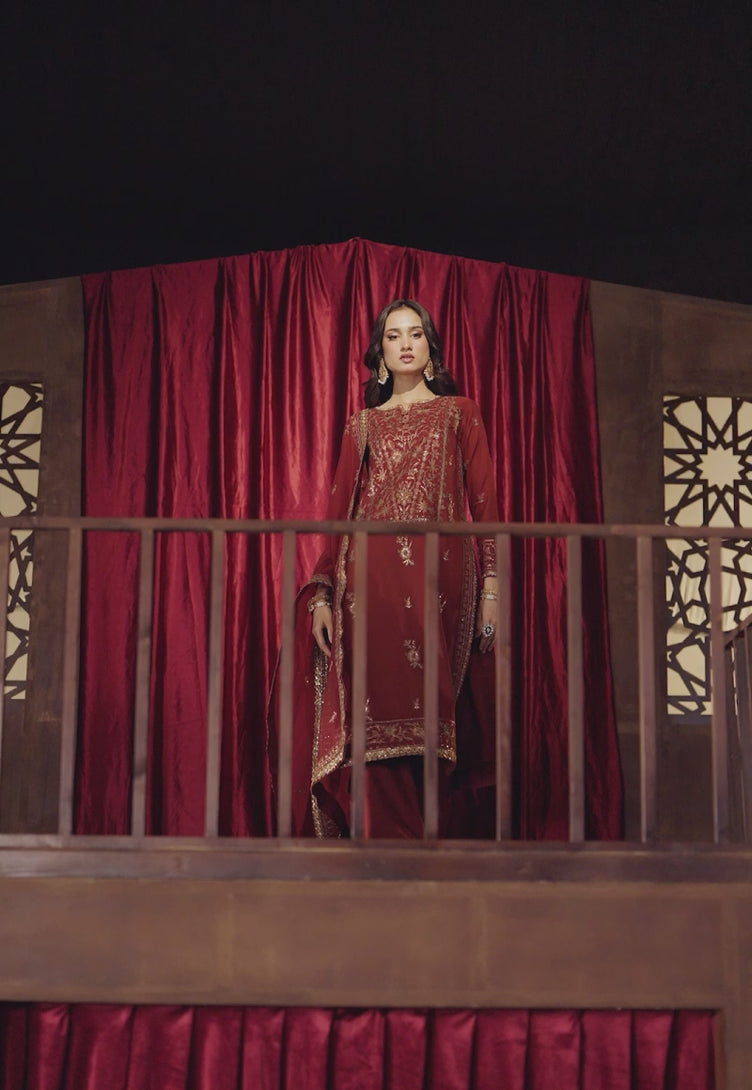Rooted in tradition yet refined with modern grace, this dark rust ensemble evokes the warmth of heritage. The shirt is adorned with gleaming gold zari and sequins, intricately embroidered with rust and sage-hued threads that echo the earthy richness of the design. Paired with a softly embroidered dupatta that adds just the right touch of detail, this ensemble feels like a modern beauty worn with pride.
