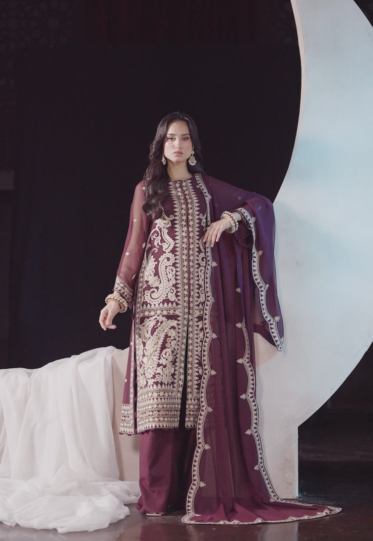Bathed in the richness of plum, this ensemble feels like poetry stitched into fabric. The front-open shirt showcases masterful aari embroidery, where soft beige threads and antique gold zari trace delicate patterns like whispers across the canvas. The design exudes an impeccable aura, effortlessly merging traditional craft with a contemporary silhouette. Completing the look, the dupatta is adorned with refined embroidery and finished with scalloped edges—like a gentle flourish at the end of an elegant verse.