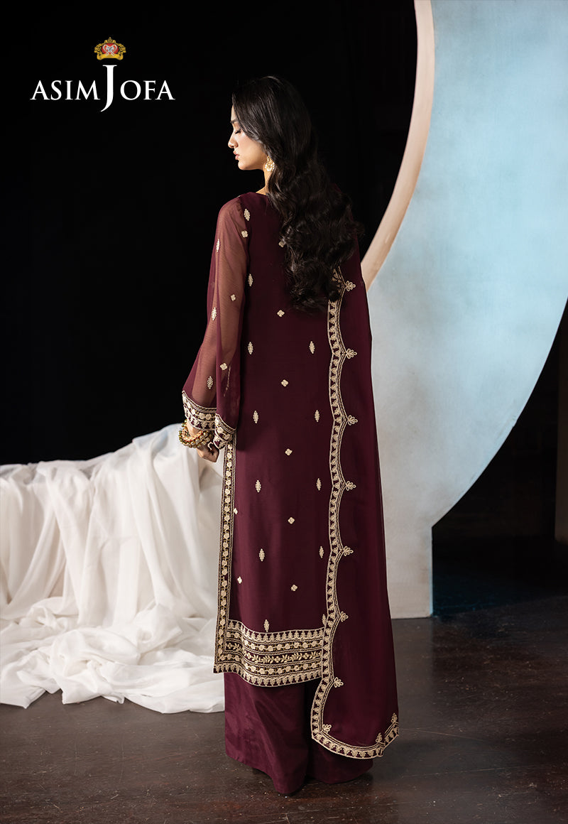 Bathed in the richness of plum, this ensemble feels like poetry stitched into fabric. The front-open shirt showcases masterful aari embroidery, where soft beige threads and antique gold zari trace delicate patterns like whispers across the canvas. The design exudes an impeccable aura, effortlessly merging traditional craft with a contemporary silhouette. Completing the look, the dupatta is adorned with refined embroidery and finished with scalloped edges—like a gentle flourish at the end of an elegant verse.
