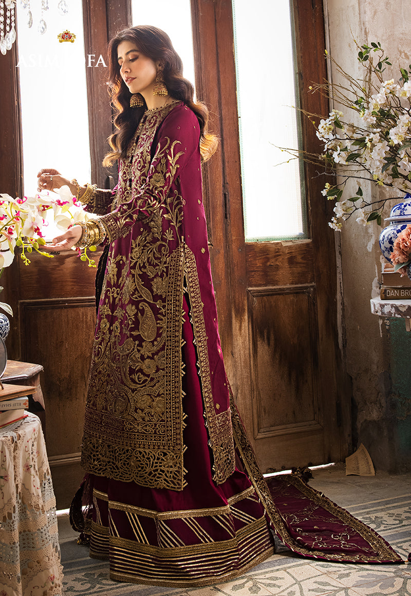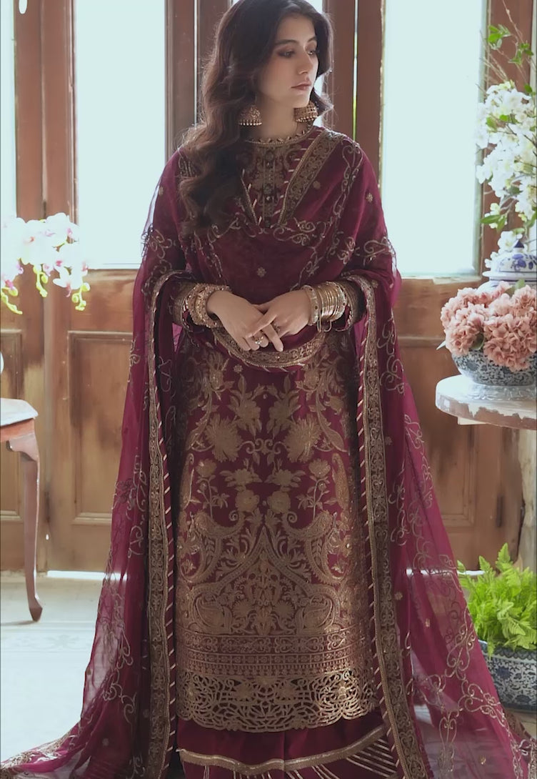Syra Yousuf looks majestic dressed in this deep maroon attire. Festooned with antique gold zari & thread interlaced with matte sequins creating this sprawling design of paisleys & floral elements adding life on this deep tone. An intricately worked cutwork border runs along the shirt hem topped with embroidered chiffon dupatta & dyed trouser.