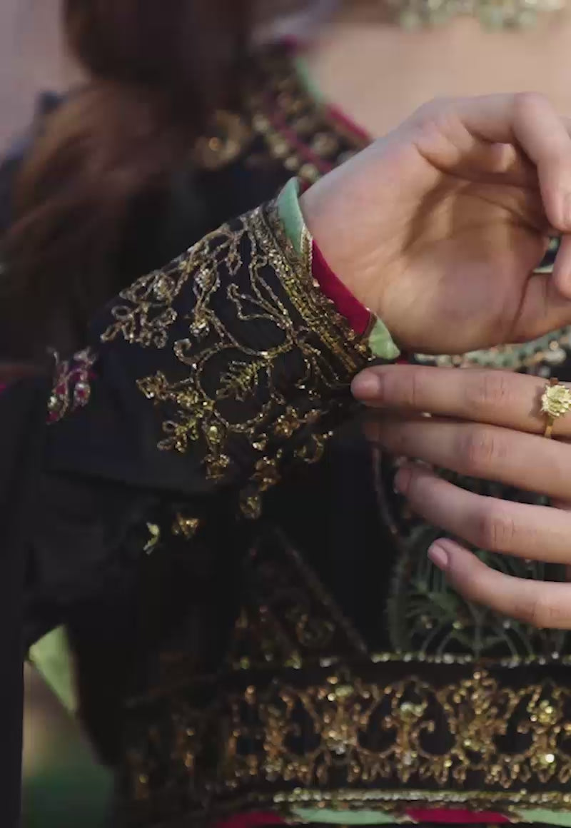 Komal Meer channels a princess donning this kalidaar peshwas made on lustrous black charmeuse silk with antique gold dori and zebra sequins worked beautifully on it. Magenta & sage green threads are used to add a pop of color. A broad embroidered border runs along the hemline. The bodice is done with geometric motifs embroidered on it. The peshwas is complemented with an embroidered chiffon dupatta with diagonal lines all over it and dyed silk pants.