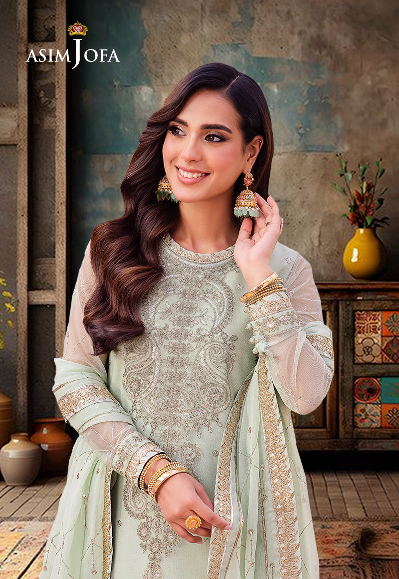 Asim Jofa unveils the “Jag Mag Collection” with this creation where it meets magnificence. This mint number is a symphony of craftsmanship. The neckline of this outfit blooms with intricate embroidery cascading down to the borders in a mesmerizing dance of two-toned zariwork. Each golden sequin twinkles while illuminating the fabric. The traditional motifs tell stories of heritage and joy while the matching embroidered dupatta completes the celestial ensemble. Be the radiant center of every celebration with this luminous creation.