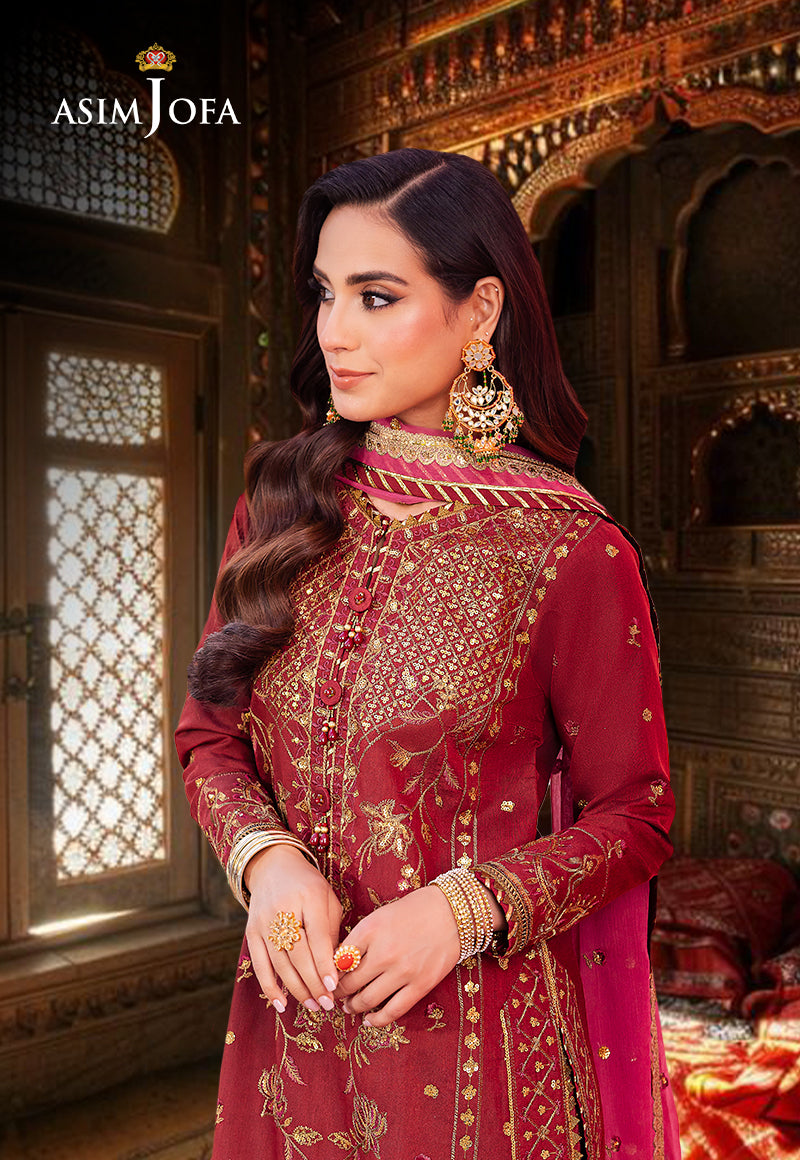 Asim Jofa’s “Jag Mag Collection” unveils this creation that marries the earthy tones of rust with the royal essence of purple. The ensemble’s shirt is a canvas of celebration where the neckline is not just embroidered but crowned with gold sequins and zari complemented by the vibrant strokes of magenta threadwork. The purple embroidered dupatta is the perfect counterpart framing this outfit in a narrative of elegance and festivity. Adorn yourself in this ensemble and embody the spirit of celebration.