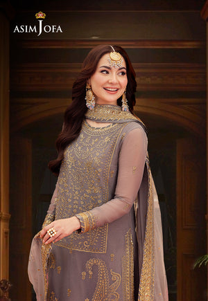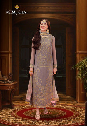 Stay radiant with Asim Jofa’s “Jag Mag Collection”. This grey ensemble is a canvas of celebration meticulously embroidered with 3mm gold sequins that catch the light and zariwork that weaves through the fabric like golden threads of joy. The motifs are a constellation of tradition and modernity shimmering with every move making you the embodiment of the collection’s spirit—radiant at every event. This outfit is a statement of elegance and festivity designed to make you stand out and shine with an ethereal glow.