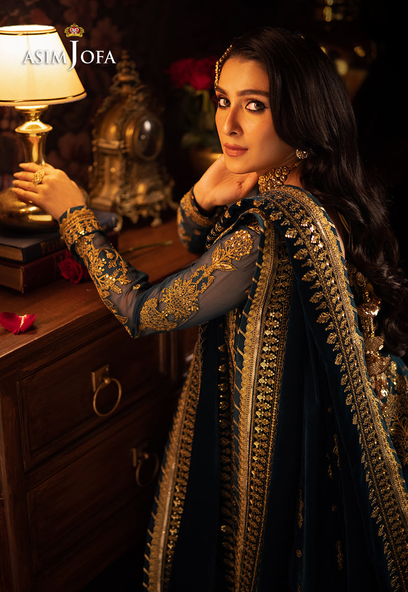 Embrace the majestic vibe of this teal ensemble, adorned with antique gold zari and gold cupped sequins, creating a splendorous display of intricate embroidery. The embroidered shirt showcase opulence in every stitch. The embroidered daaman and motifs on the sleeves add the richness in the design. The embroidered velvet shawl with two side borders and motifs at the pallu corners, is a regal masterpiece, making it a celebration of antique gold splendor.