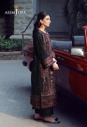 An enchanting midnight crafted for festive grandeur. The black shirt is richly adorned with cherry red, sage green, and rust threadwork, forming a lavish embroidered tapestry that commands attention. Balanced by a chiffon dupatta bursting with vibrant hues, this ensemble is designed for dramatic entrances and unforgettable Eid evenings.