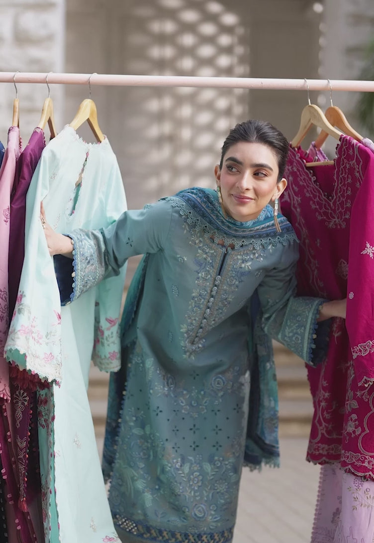 A luminous composition inspired by festive opulence. The dark aquamarine shirt is elevated with intricate threadwork and delicate boring techniques, forming floral and natural motifs that feel richly detailed yet perfectly balanced. Accompanied by a tonal printed chiffon dupatta, this ensemble embodies sophisticated elegance with a refreshing edge—ideal for stylish Eid gatherings.