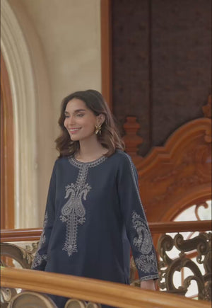 Flaunt your timeless style dressed in this minimal embroidered Dark Blue One-Piece, A perfect blend of beiges and blues with hints of sequins.