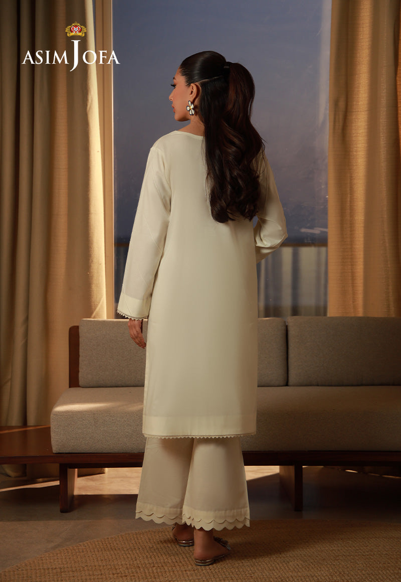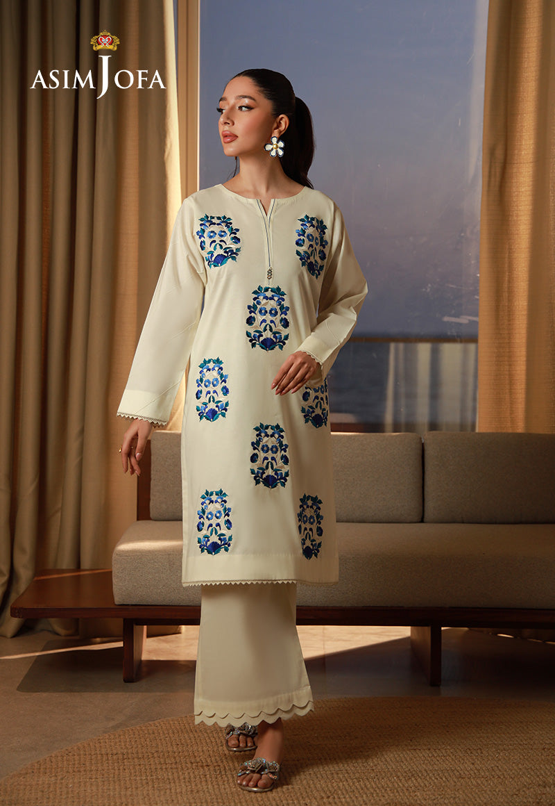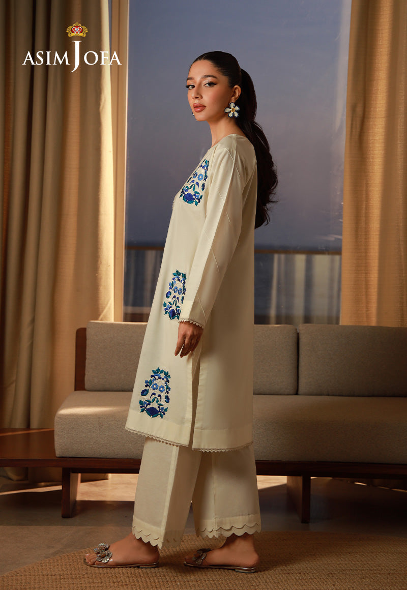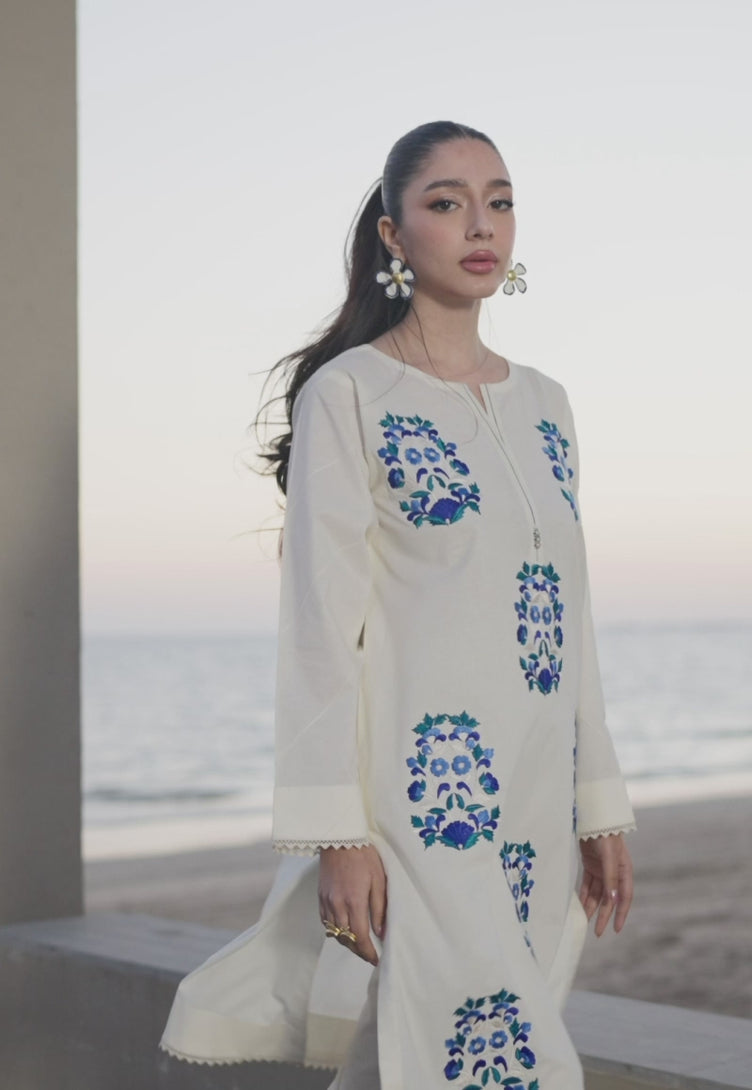 Radiating refined charm, this white ensemble offers a visually captivating look. The shirt is adorned with embroidered motifs in a striking contrasting hue, this gorgeous design is perfectly balanced by the stylishly tailored trousers, which feature a scalloped hemline for a hint of playful elegance.
