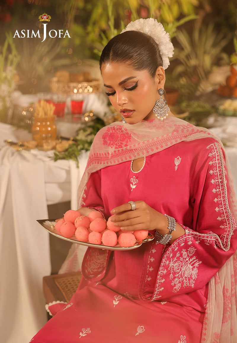 Embrace ethereal charm in this pristine pink ensemble, where elegance meets artistry. The shirt is adorned with intricate ivory threadwork, weaving a mesmerizing play of contrast and detail. Embroidered sleeves add a touch of refined finesse. Paired with a beautifully printed dupatta in a striking contrast, this ensemble radiates effortless allure.
