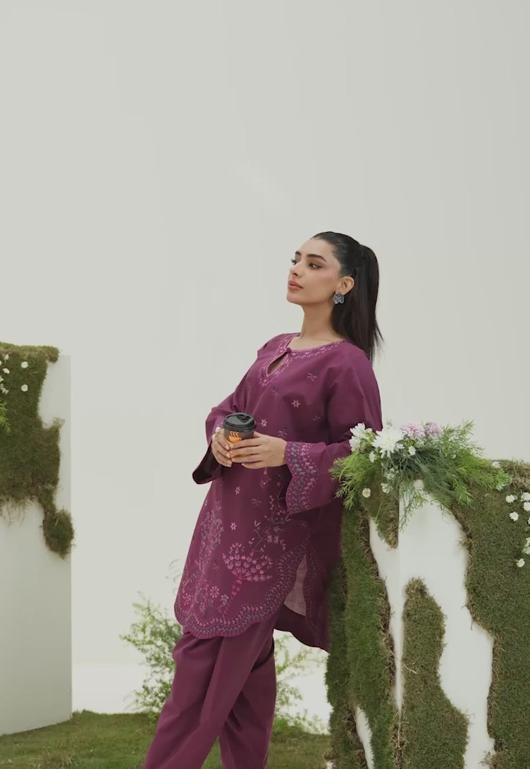 Deep and romantic, this plum ensemble unfolds like a flourishing botanical dream. Garden-inspired embroidery blooms across the shirt, where floral and foliage motifs intertwine in a composition that feels lush yet harmonious. Scalloped edges along the sleeves and hem carve a graceful outline, adding definition to the silhouette. Accompanied by meticulously stitched plain trousers, this ensemble offers a rich, artful approach to everyday elegance.