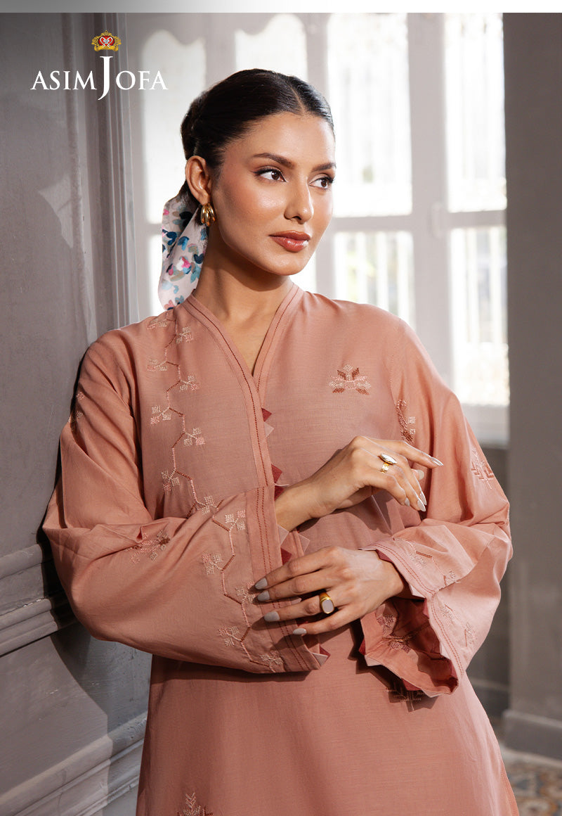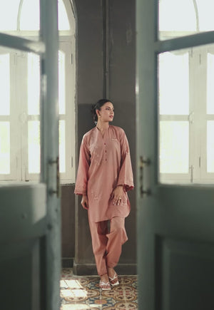 This soft brown ensemble features a shirt adorned with gorgeous minimal embroidery on the front and sleeves, paired seamlessly with sleek, tailored trousers — a perfect blend of grace and simplicity.