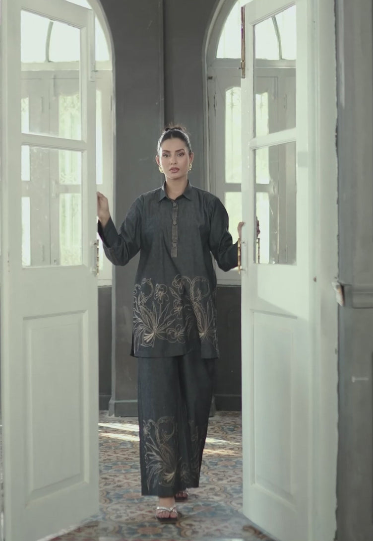Classic meets contemporary in this chic black outfit, where subtle embroidery in a contrasting lighter shade adorns both the shirt and trousers, giving the outfit a gorgeous touch. Effortlessly stylish, it’s the perfect pick for a fun day out with your besties.