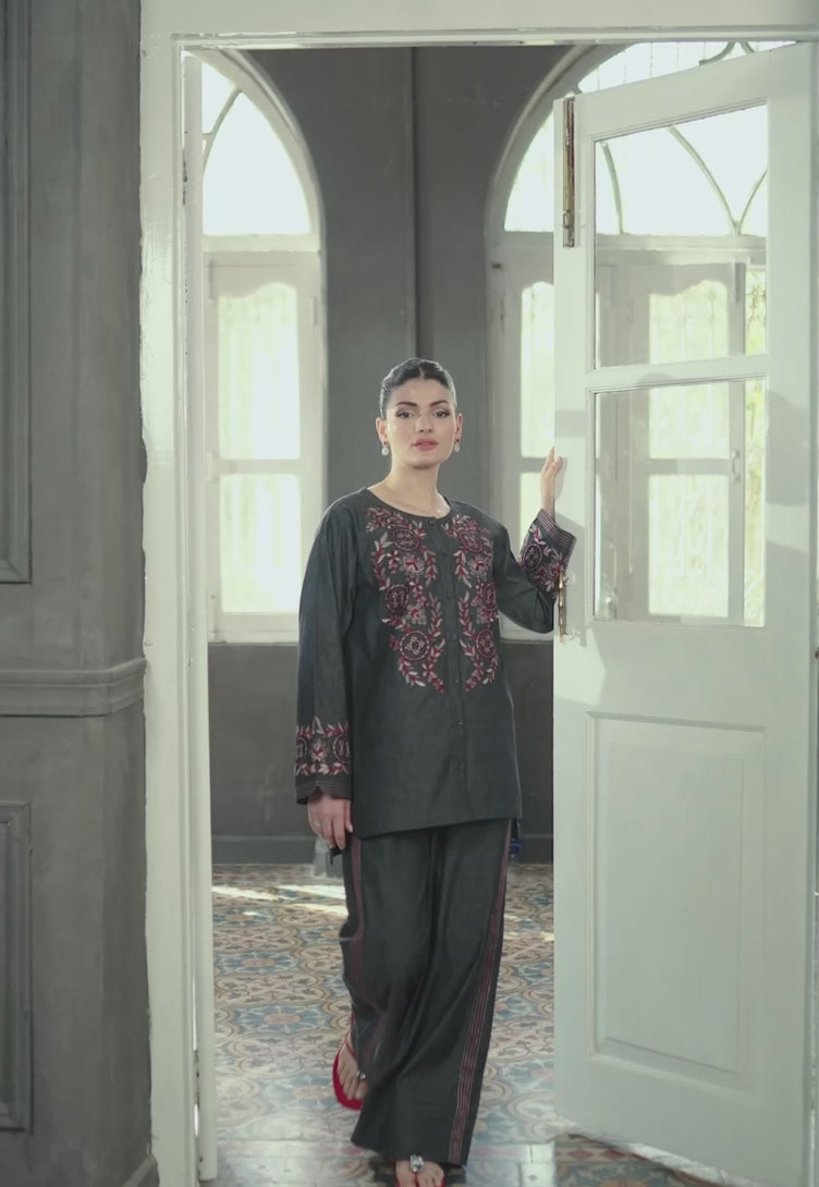 This grey ensemble stands out with its floral embroidery in rich crimson and beige threadwork, creating a striking contrast against the dark base of the shirt. Paired with stylishly tailored trousers featuring subtle maroon accents, it’s a refined look with a hint of bold flair.
