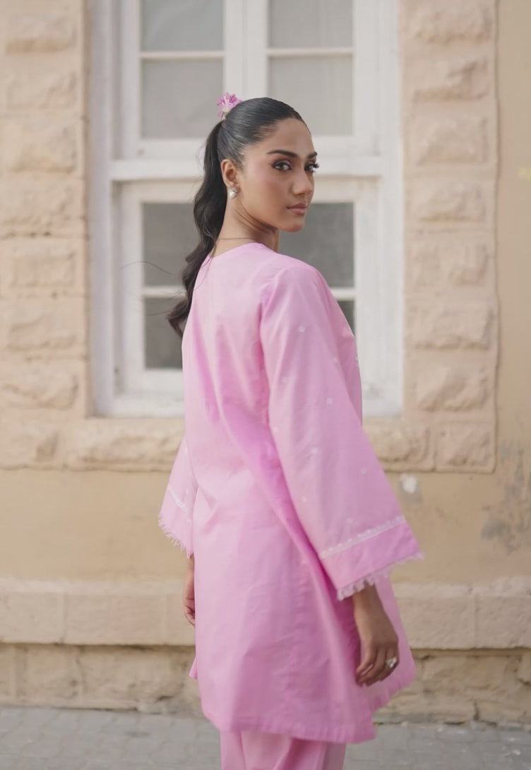 A portrait of pastel perfection, this pink outfit showcases a beautifully crafted neckline adorned with ivory-hued threadwork, adding delicate texture and charm, enhanced by the subtle detailing on the sleeves. Paired with neatly tailored trousers, it’s an effortlessly graceful ensemble for any occasion.