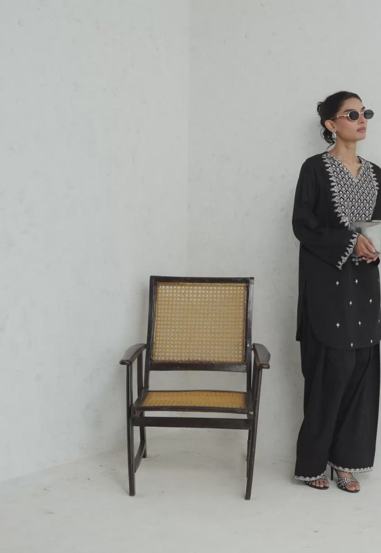 Taking monochromatic chic to the next level, this striking black outfit features a shirt adorned with ivory-hued embroidery, creating a visually captivating contrast. Paired with trousers showcasing minimal embroidery along the hem, it’s a bold yet refined statement in style.