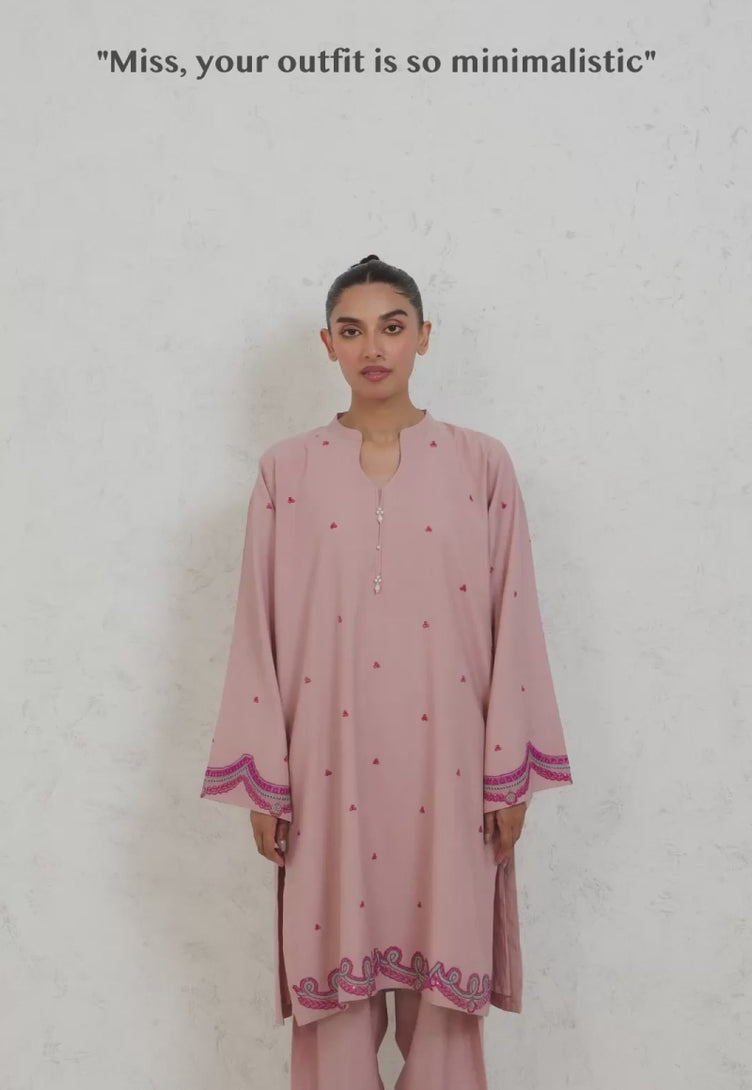 Effortlessly chic, this pink outfit embraces minimalism with a touch of charm. The shirt features refined embroidery in a deeper shade, creating a gentle yet striking contrast. A multicolored printed dupatta brings a lively accent, while the understated trousers complete the look with graceful simplicity.