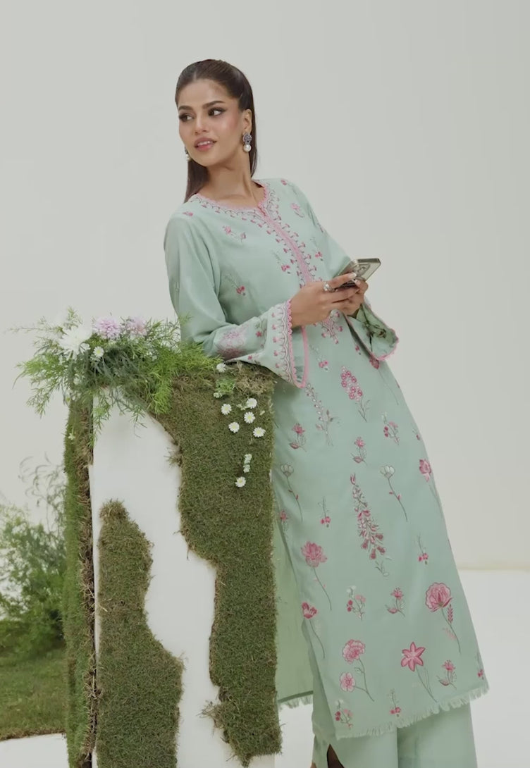 A vision of quiet charm, this mint ensemble captures the poetry of summer in its purest form. The shirt is adorned with finely rendered pastel embroidery, where whispers of pink and green threads weave through intricate florals, creating the impression of blossoms scattered across a sunlit garden. Set against the fresh mint canvas, the artwork feels airy yet striking, offering a refined look that draws the eye without overwhelming it. Paired with flawlessly tailored trousers finished with elegant scalloped hems, the look carries an effortless grace.