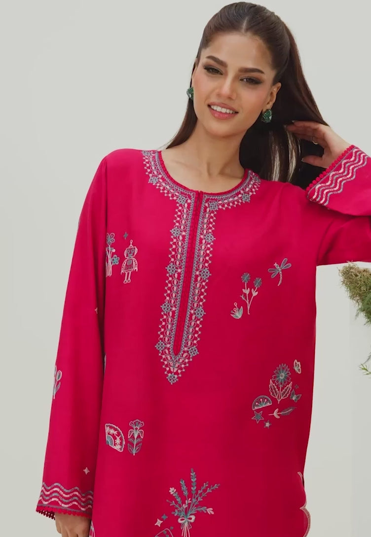 Bold yet impeccably composed, this shocking pink ensemble channels contemporary finesse through artful restraint. The shirt embraces a modern minimalist narrative, punctuated by thoughtfully scattered motifs that lend rhythm and movement to the vibrant canvas. Scalloped accents along the sides and border introduce a sculpted refinement, framing the silhouette with quiet precision. Paired with gracefully tailored trousers, the look strikes a confident balance between statement color and polished sophistication.