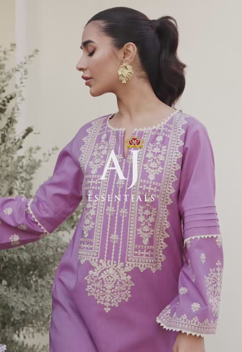 A symphony of colors and textures come together in this Orchid-toned cambric shirt and trouser ensemble, perfectly balanced with delicate embroidered borders and a timeless design that never goes out of fashion. Slay this EID with Asim Jofa’s Pret Essentials collection.