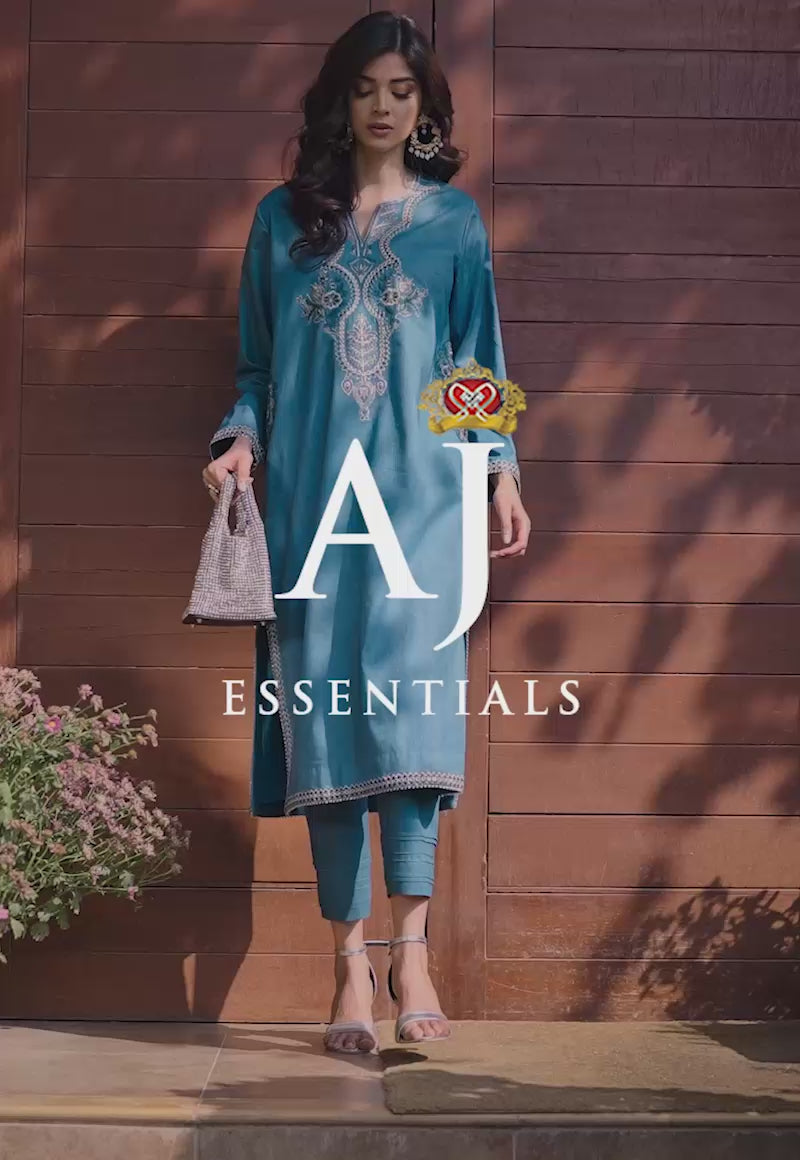 In the depths of the ocean blue, there lies a sartorial treasure that captivates the senses. Behold, a two-piece ensemble from Asim Jofa Essential collection that exudes a serene beauty, crafted with the finest cambric. The front of the shirt boasts elegant embroidery that adds depth to the ensemble. A playful pocket bunch sits in perfect harmony with the embroidered border on the sleeves and check daman for the front and back. The back and sleeves are fashioned with plain dyed cambric, providing a smooth finish, while the trouser is made of dyed cambric, completing this ensemble's cohesive look.