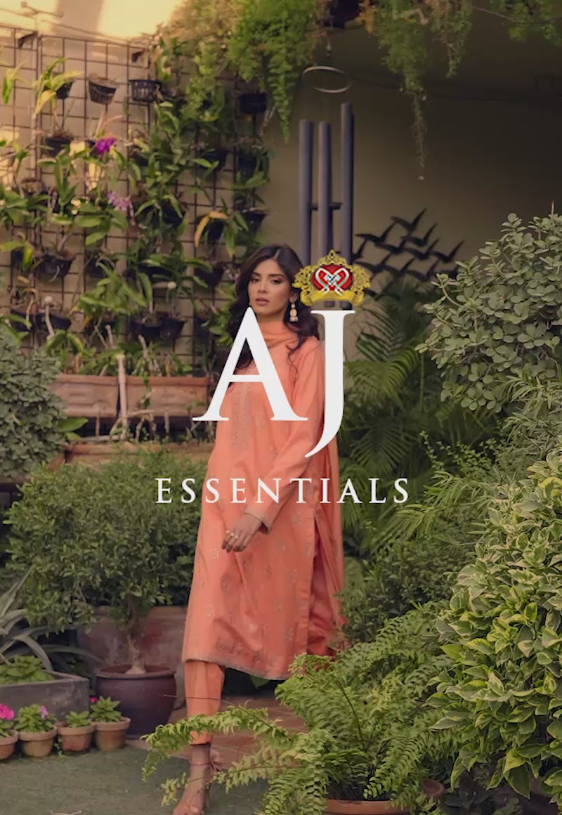 The warm and delicate tones of peach set the tone for this stunning ensemble. The intricately embroidered front and back panels on the self-jacquard lend a sense of playfulness and opulence to this elegant number. The daman border of the front panel adds a further touch of detail that speaks to the artisanal excellence of this design. The trousers are crafted in dyed cambric and the dupatta, in yarn-dyed fabric, complements the entire ensemble, adding a touch of whimsy and sophistication to the overall look. They'll turn heads wherever you go in this chic and alluring Asim Jofa’s Essential piece.