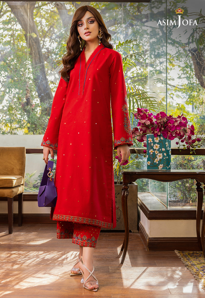 Slay this tango red cambric shirt, with rocking embroidery which is the star of the show. This shirt is a monument to the designer's devotion, from the embroidered bunches embellishing the sleeves to the subtle chann on the front and sleeves with contrasting borders. The embroidered trim around the trouser legs makes the whole outfit look polished and put together.
