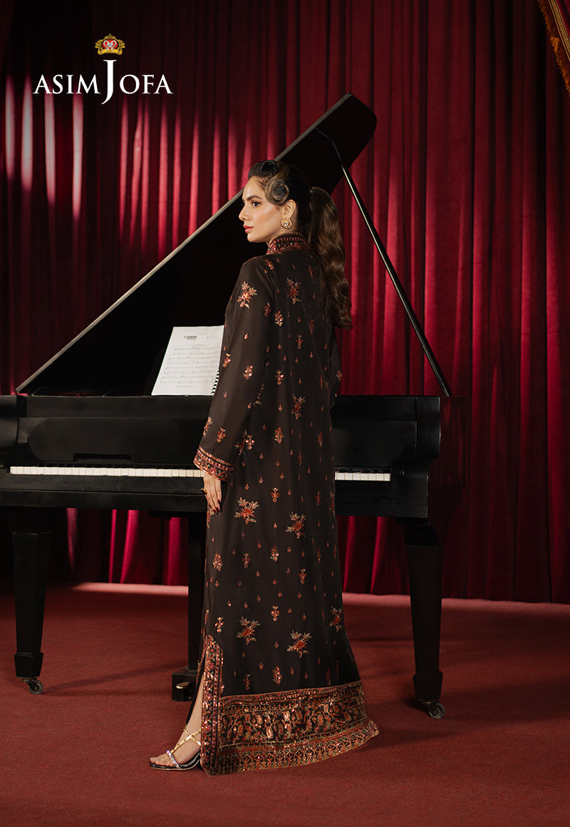 This brown kaftan embodies understated luxury with its effortlessly flowing silhouette and embroidery. Featuring a heavy border adorned with copper-toned sequins and 3mm cupped sequins, it shimmers with a refined radiance, while delicate sage green and rust threadwork weaves a story of elegance. Minimalistic floral motifs bloom across the fabric, adding a touch of grace to the ensemble. Designed for those who appreciate subtle opulence, this kaftan is a perfect exhibit of modern yet timeless look.