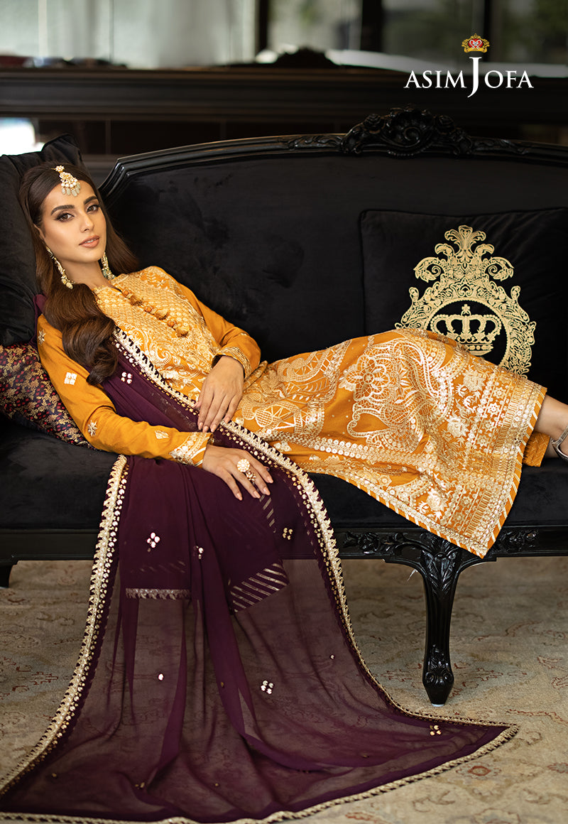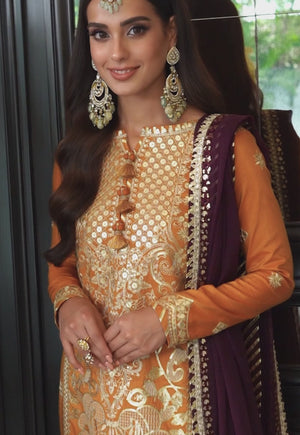 Artfully woven with enchanting beige thread embroidery, this bright hue of mustard gold is adorned with 9mm and 3mm sequins in matte gold color. The outfit is completed with a plum dupatta, giving a contrasting effect. Exude radiant energy with “Rang-E-Noor”.