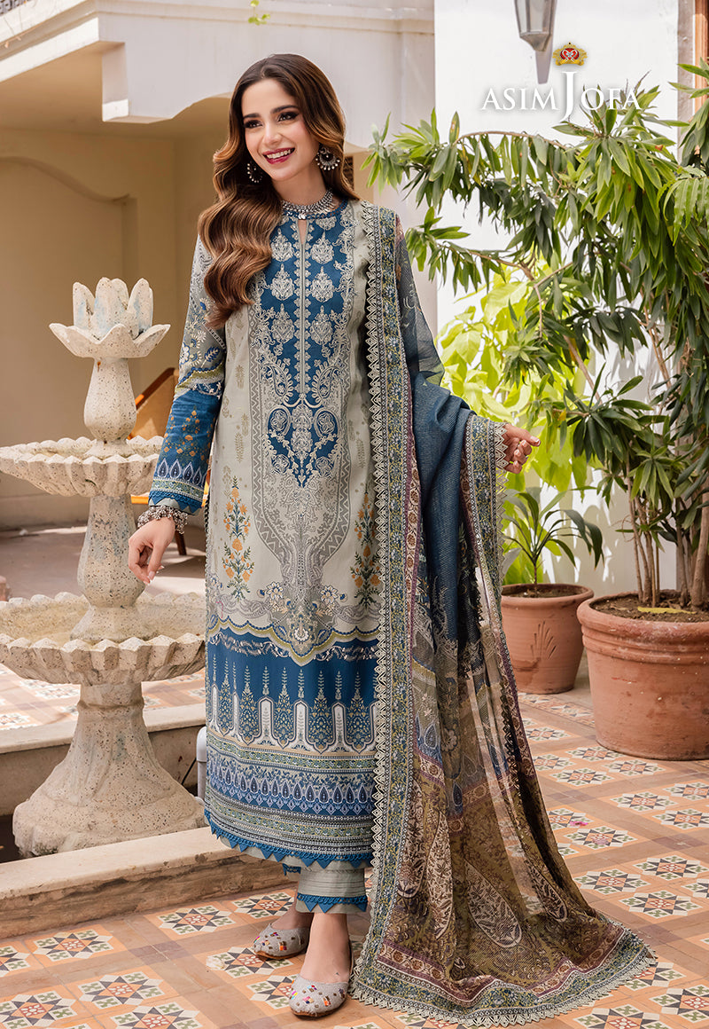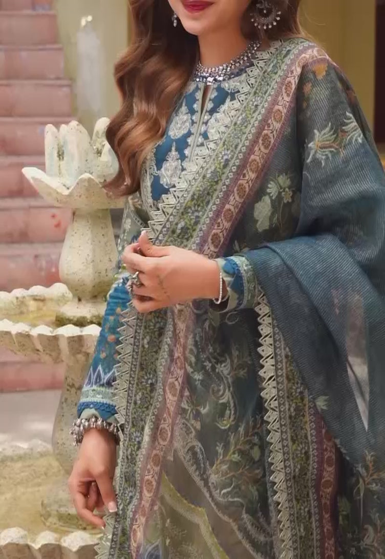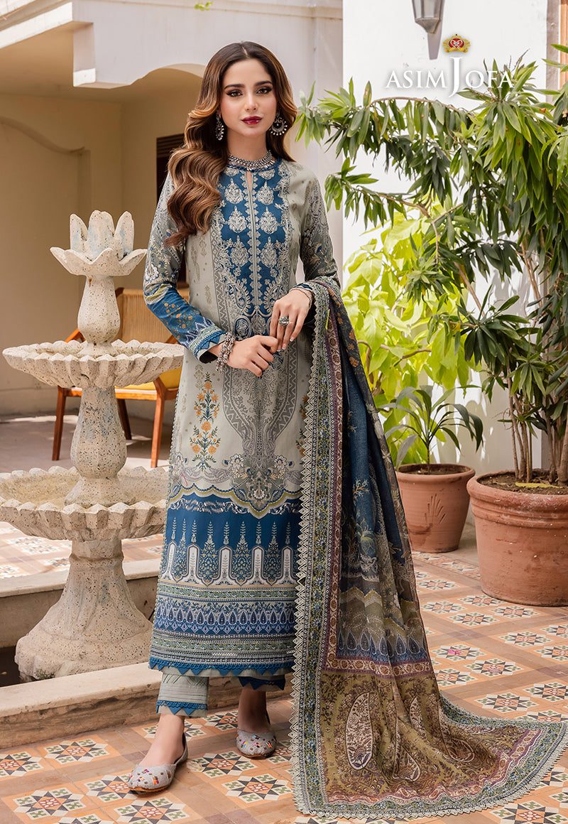 Emanate regal charm in our harbor gray ensemble adorned with captivating Mughal motifs. The embroidered neckline perfectly complements the intricate print of this ensemble, and the addition of a stunning zari-lined dupatta adds to its majestic allure.