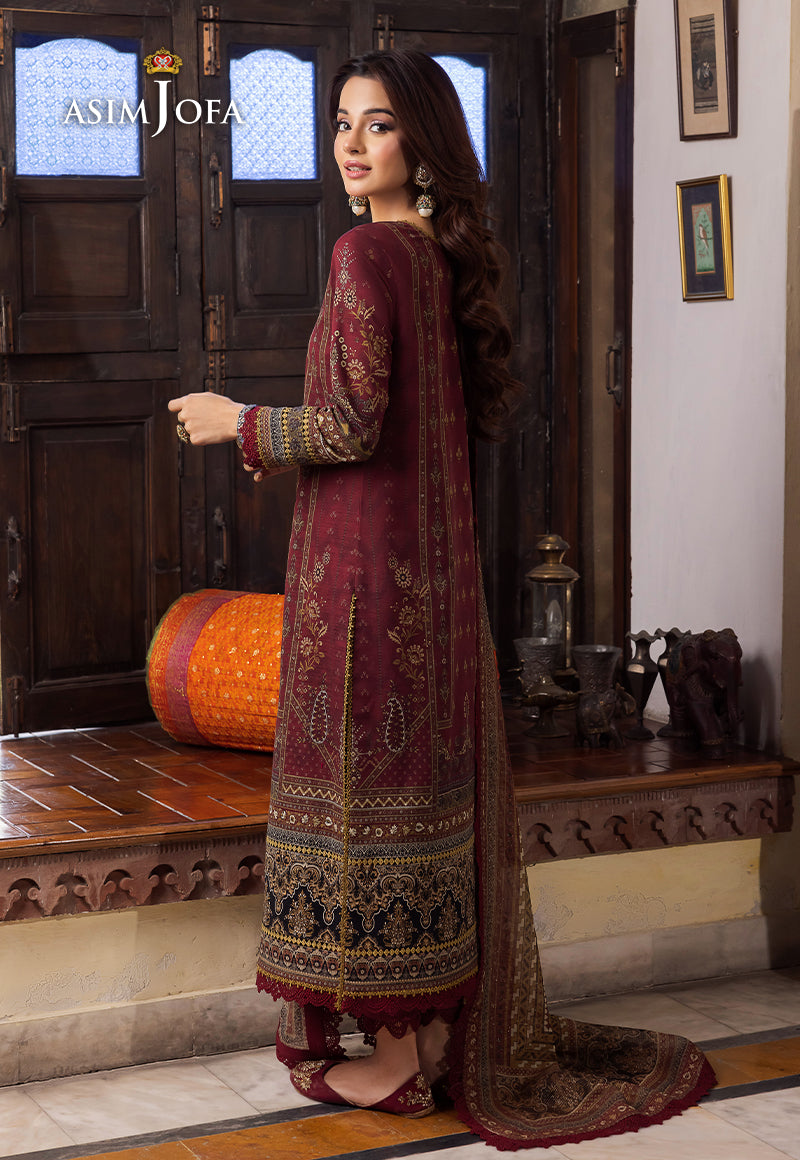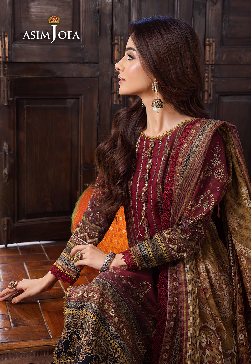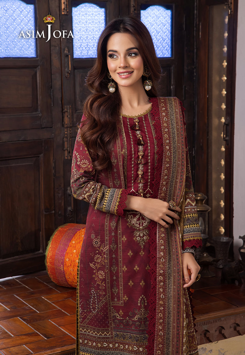 Indulge in the allure of this vibrant red ensemble, highlighted by an embroidered neckline adorned with sequins. The shirt is elegantly printed with art nouveau motifs and baroque elements, mirroring the grandeur of the zari-line dupatta.