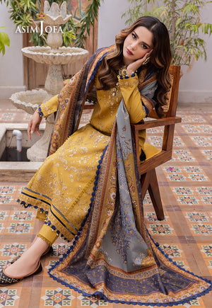 Experience timeless elegance with this classic mustard outfit, embellished with elaborate and heavy embroidery. The radiant golden zari-work adds a touch of exquisite beauty to this outfit, while the contrasting blue silk dupatta enhances it beauty, turning it into a charming design.