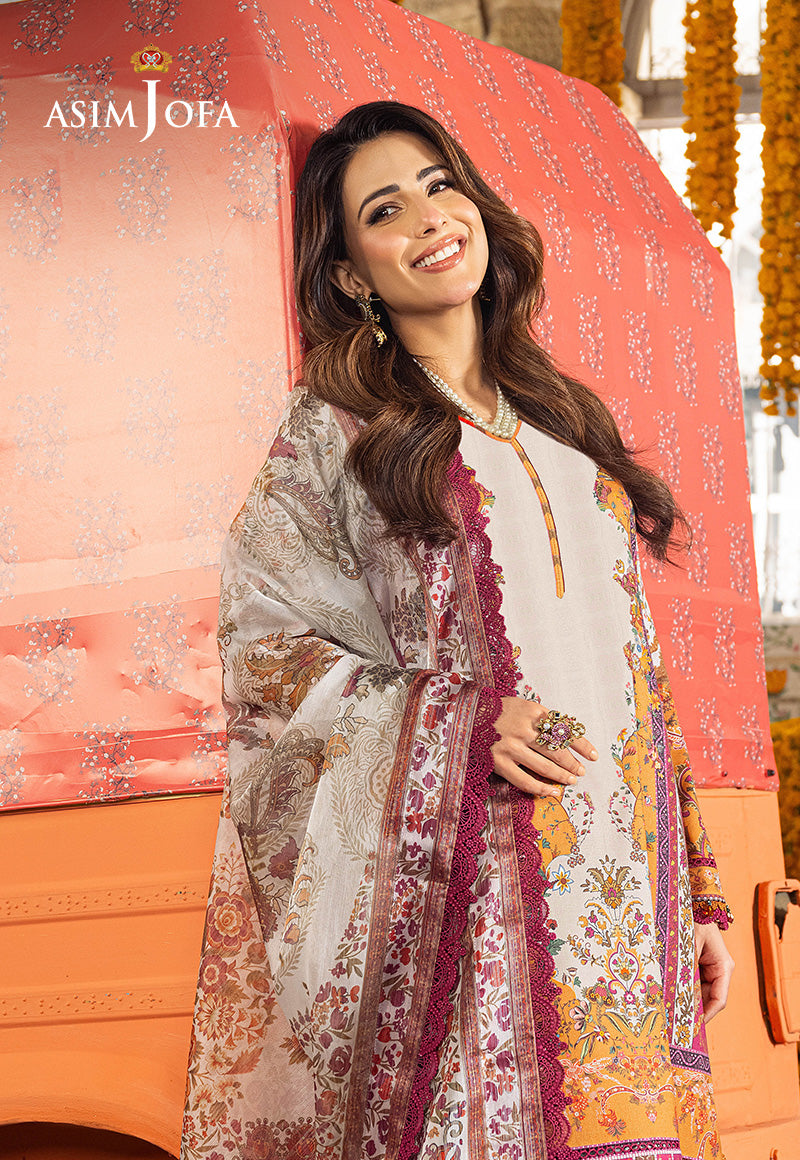 Immerse yourself in the timeless elegance of this exquisite design from Asim Jofa's "Aira – Summer Print Collection". The embroidered neckline adds a touch of refinement to the ensemble, while the digital printed shirt showcases motifs influenced by Mughal architecture, reflecting sophistication and grace. This fuchsia outfit epitomizes elegance in every detail. The delicate embroidery on the neckline enhances its allure, adding a touch of regal charm. its elegant vibe becomes palpable inviting you to embrace the richness of tradition with a contemporary flair.