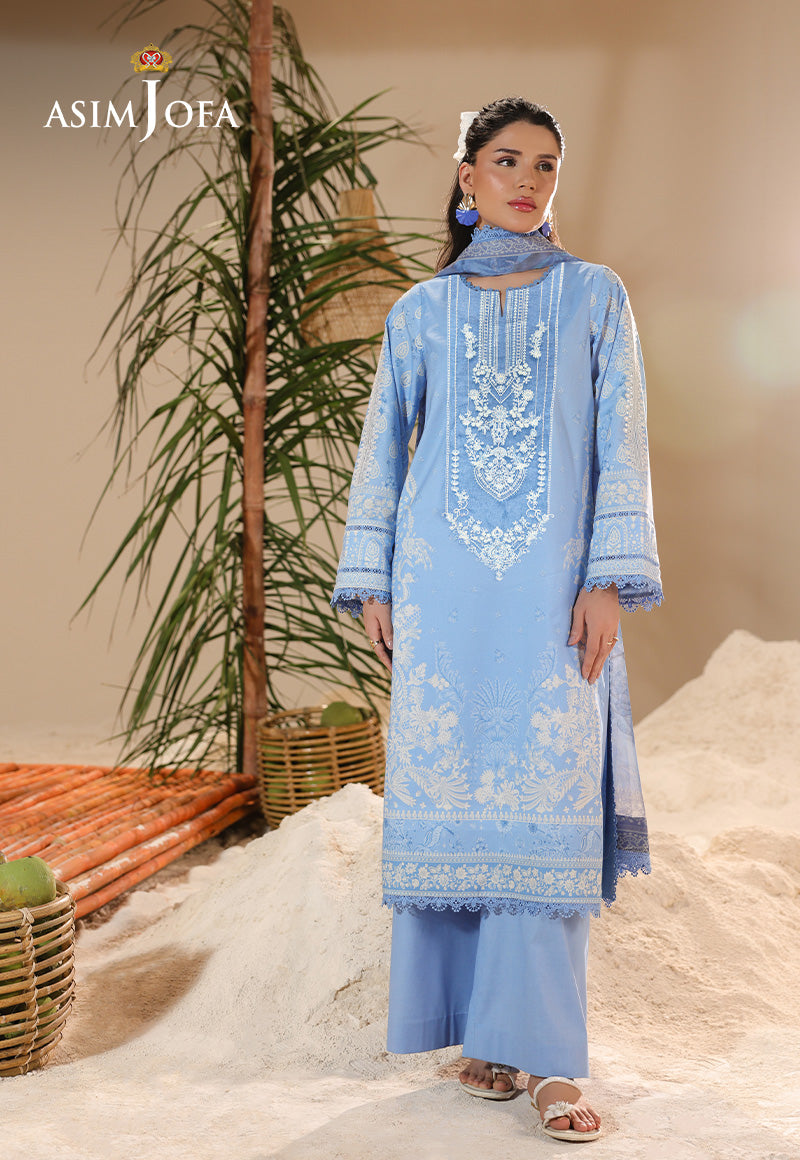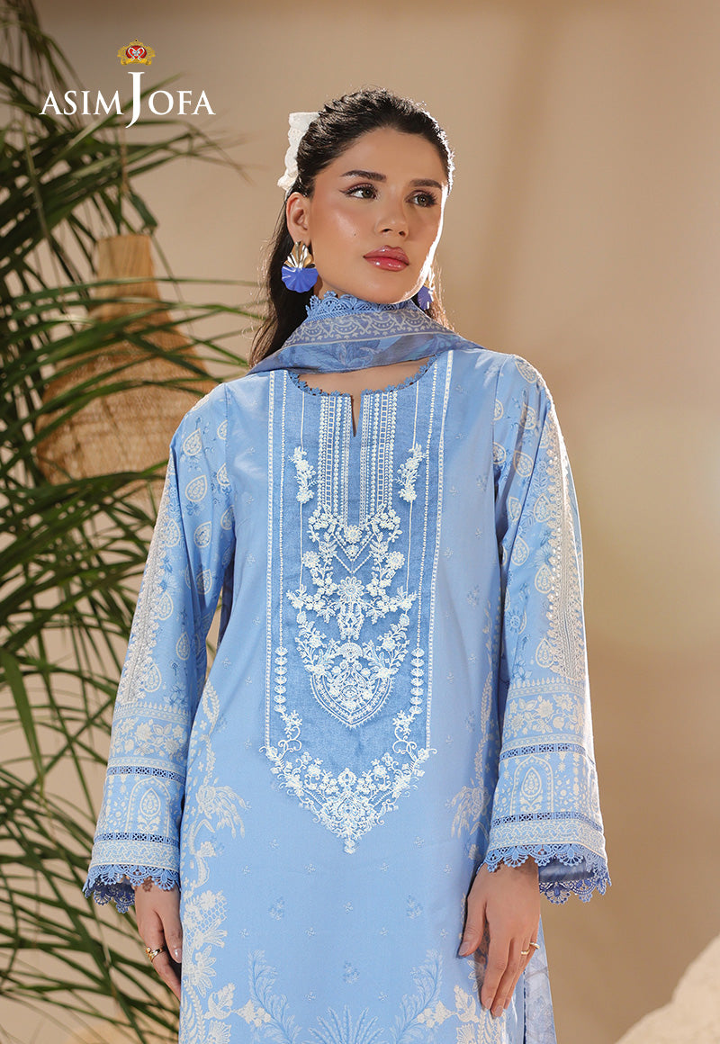 Like clear skies over quiet waters, this sky blue ensemble breathes serenity. The soft print is enriched by thread and sequin embroidery on the neckline and sleeves, glimmering like sunlight skipping across a lake. A printed chiffon dupatta adds the final touch of summer ease.
