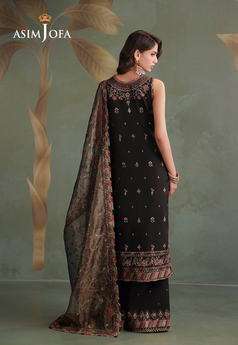 Bold artistry defines this black ensemble, designed for evenings that demand an unmistakable presence. The shirt showcases striking motifs placed with precision, embroidered in magenta, tea pink, and sage green threadwork, further elevated with antique gold zari and shimmering cupped sequins. Offering the versatility of two distinct styling options, the design balances dramatic flair with refined elegance. Paired with an embroidered trouser and a finely worked dupatta, this ensemble is a sophisticated statement of timeless glamour and confident style.