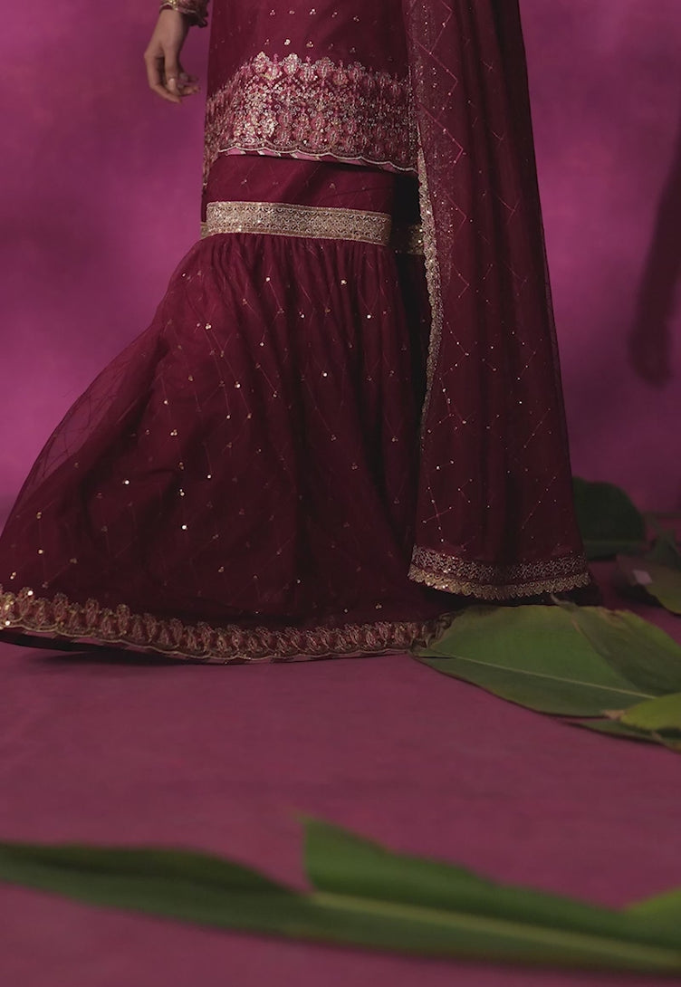 Embrace a timeless celebration of color with this radiant reddish-pink ensemble, designed to transcend festive occasions with its vibrant energy and meticulous craftsmanship. The shirt is highlighted by a heavily ornate neckline that flows seamlessly into a shimmering chann of sequins, beautifully framed by a striking border enriched with gold zari and rust-toned threadwork. Styled with a lavishly embroidered gharara—versatile enough to be tailored into a lehenga according to preference—and completed with an intricately embroidered dupatta, this ensemble stands as a true embodiment of traditional grandeur and regal elegance.