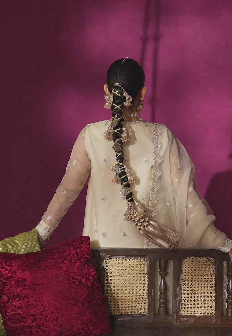 Exude the pure allure of serenity with this ivory ensemble, a front-open silhouette that exemplifies tonal elegance and refined texture. The organza shirt is exquisitely embroidered with a harmonious blend of ivory and soft peach threadwork, delicately accented with light gold zari and shimmering sequins for subtle brilliance. Balanced with printed malai silk trousers in soothing pastel hues, the look forms a graceful symphony of color. Completed with a beautifully embroidered dupatta featuring scalloped borders, this ensemble offers an elevated expression of timeless sophistication.