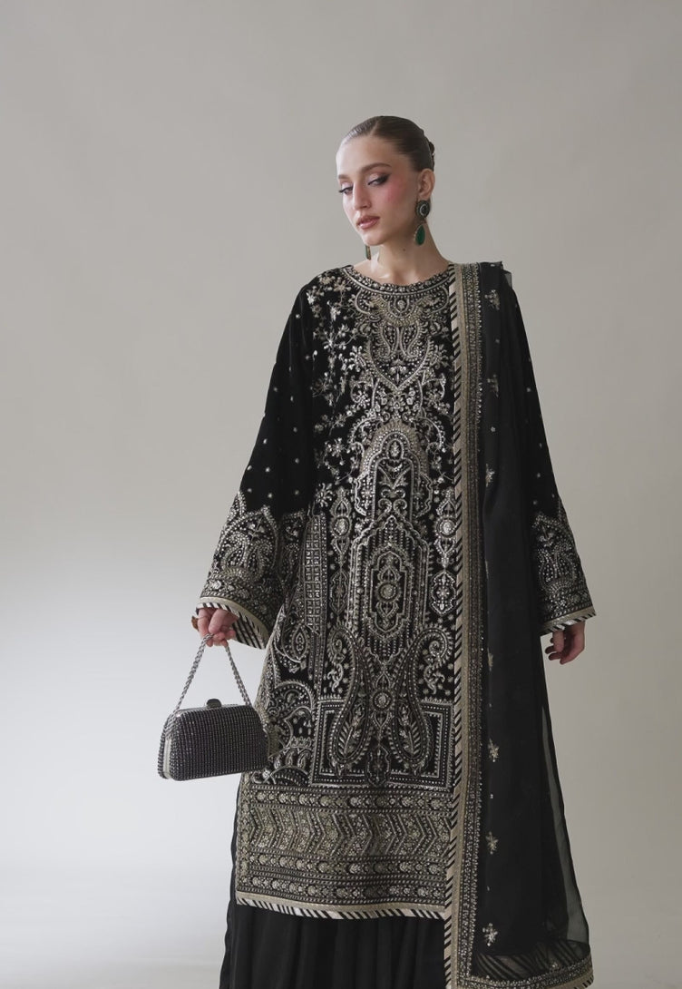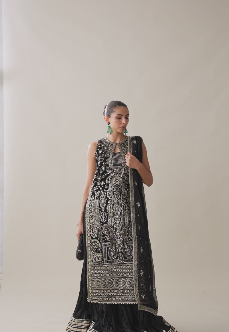 This black velvet ensemble rises like a quiet empire, commanding, unhurried and steeped in a richness that feels almost sovereign. Light gold zari and sequins trace the shirt like strokes of dusk meeting dawn, creating a glow that doesn’t shine loudly but reverberates with festive grandeur. The embroidery holds its own gravity, drawing the eye the way a flame pulls the gaze in a darkened room. Paired with an intricately embroidered dupatta that moves with the grace of whispered rites, the outfit becomes an experience that is profound, regal and unforgettable. Presented in two bespoke stylings, ensuring you attain the exquisite aesthetic you desire.