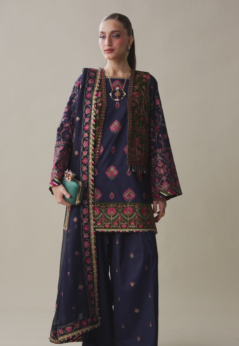 Steeped in the richness of jewel-toned opulence, this navy blue creation amalgamates the beauty of raw silk and velvet in a quiet conversation, each heightening the other’s grandeur. The velvet waistcoat is a canvas of color, adorned with embroidery in bright pink, serene green and vivid blue, intertwined with antique gold zari and sequins that shimmer with controlled brilliance. The raw silk shirt picks up the same palette, creating a rhythm of hues that feel both regal and contemporary. Paired with embroidered trousers and an embroidered dupatta, the ensemble radiates a deeply sophisticated charm.