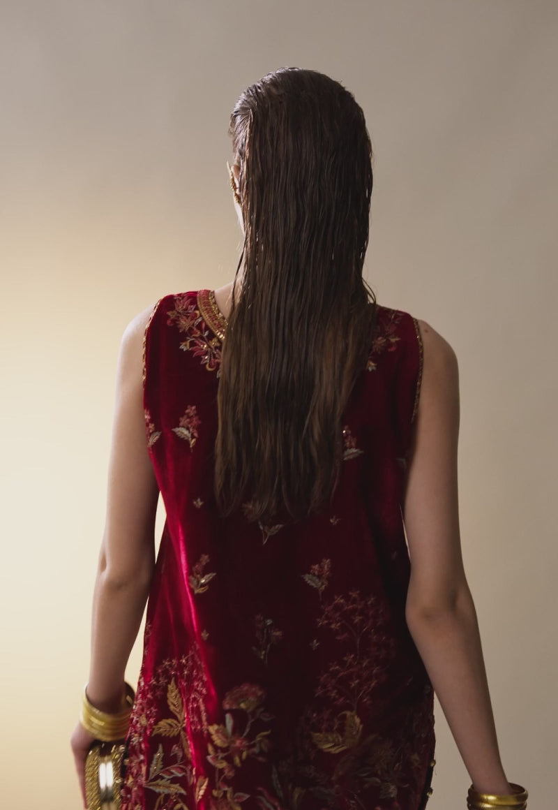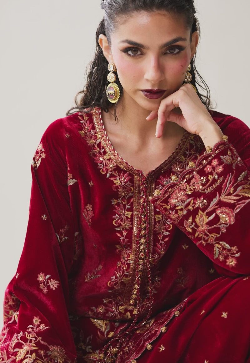 Forged in the glow of burnished luxury, this maroon-red velvet ensemble carries the warmth of a late winter sunset, its shirt alive with rust, honey mustard and green threadwork that weave a tapestry of rich tonal play. Antique gold sequins and subtle glimpses of zari punctuate the design with glints of brilliance, giving the embroidery a refined luminosity. Paired with embroidered trousers and photographed in two distinct styling forms, the ensemble invites creative freedom while retaining its inherently imperial aura.