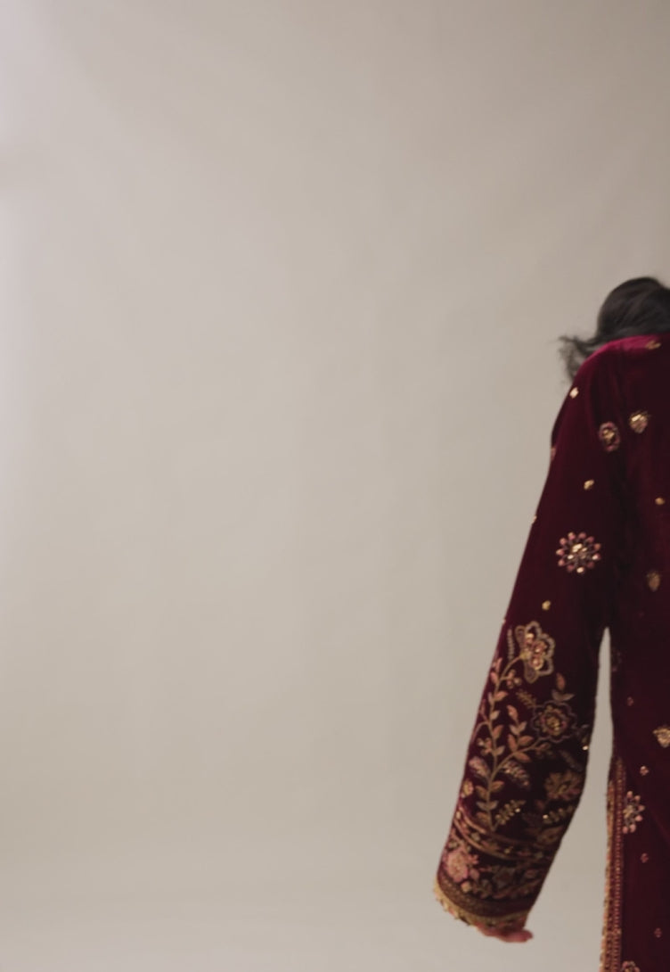 Captured in the depth of imperial mahogany, this deep maroon ensemble carries the echo of Mughal courts, its short shirt shaped by the discipline of royal artistry where antique gold zari and antique gold dual-sequins in cupped and 3 mm styles interplay with rust and deep gold threadwork, forming a surface that glows with sculpted richness. Paired with a heavily embroidered zari net dupatta and refined embroidered trousers, the ensemble becomes a harmony of trend and tradition, crafted for the woman who inhabits both worlds with ease.