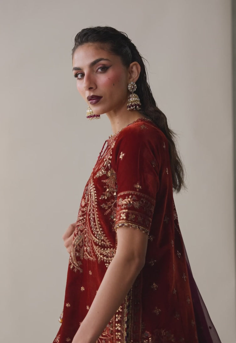 Caressed in the warmth of sunlit earth, this rust velvet ensemble holds the allure of a sunset, its short shirt adorned with a richly embroidered front and back built from ethnic motifs that feel deeply rooted. Antique gold zari and cupped sequins are joined by threads of green, fuchsia, purple and light rust, creating a tapestry of color that feels vibrant yet grounded. The embroidered silk trousers in a lighter rust shade complement its palette, while the contrasting magenta dupatta adds a striking counterpoint like a twilight sky. The result is an ensemble bursting with texture, color and a luxurious rhythmic flow.