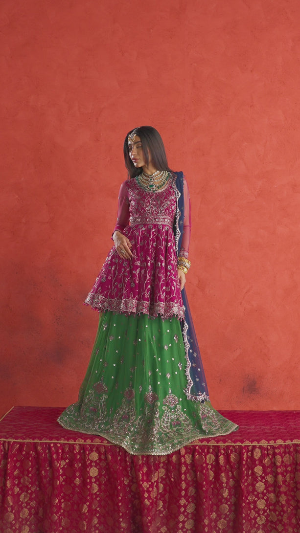 A vibrant collision of jewel tones, designed for the woman who finds her rhythm in the heart of a celebration. This fusion masterpiece features a peplum-style shirt in high-octane magenta, illuminated by light gold zari and a kaleidoscope of royal blue and emerald threadwork. The emerald-hued lehenga, composed of intricately embroidered kalis, flares with a structural drama that commands the room. Draped in a royal blue dupatta that glows with stunning craftsmanship, this look is a festive anthem for the nights that never end.