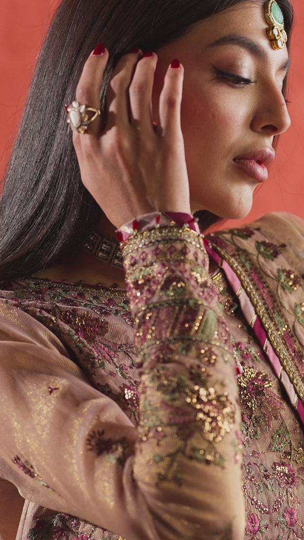 A whisper of dusk captured in silk, where the softness of tea pink dissolves into the shadows of a wild garden. This ensemble is a symphonic blend of purplish pink, deep tea pink, and sage green threadwork, evoking a floral landscape under a silver moon. Two-toned antique gold zari and cupped sequins provide a vintage luster that feels inherited rather than made. Below, a crushed lehenga ripples with every movement, framed by a monumental embroidered border, while the four-sided embroidered dupatta envelopes the wearer in an aura of ethereal grace.