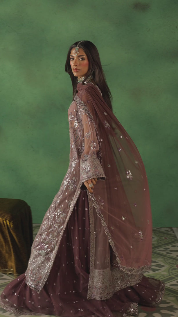A soft, moonlit dream where the coolness of silver meets the romantic depth of a twilight garden. This tea pink shirt is delicately traced with silver zari and silvery-gold sequins, accented by mauve and purple threadwork that feels as light as a whisper. The ensemble is redefined by its stunning mauve contrast, seen in the voluminous lehenga and dupatta, both embroidered in perfect harmony with the shirt’s palette. It is a look of soft power and feminine grace, ideal for the modern romantic.